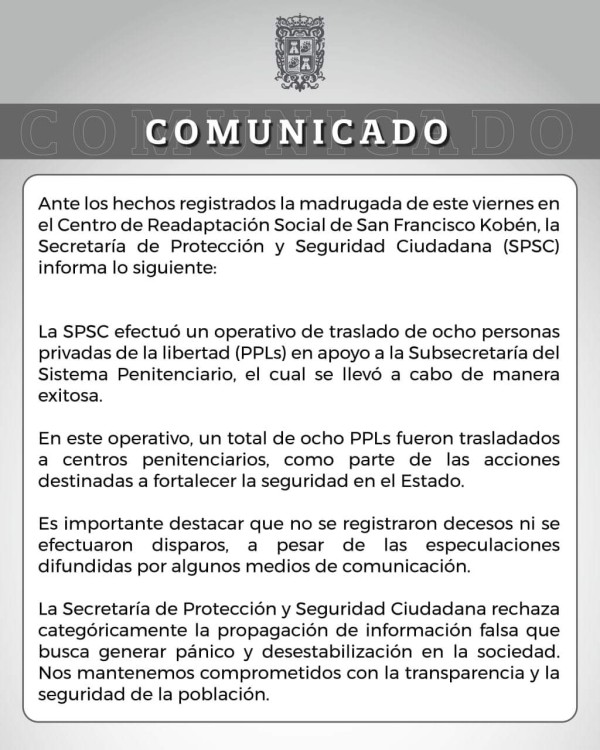 La Secretaria de Protección y Seguridad Ciudadana (SPSC) reveló a través de un comunicado que si se registró un operativo. La intención era la extracción de 8 Personas Privadas de su Libertad (PPL) hacia otro cereso.