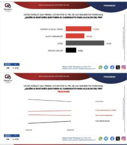Por el PRI el candidato que va adelante en la preferencia es Gaspar Quintal Parra con 27.5 puntos.