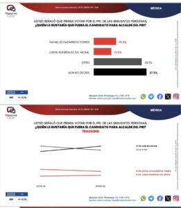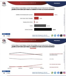 En tanto que por Morena la candidata sería Verónica Camino Farjat con 24.8 y en segundo Rommel Pacheco con 24.1 y en tercero Oscar Brito Zapata con 17.
