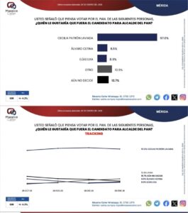 En el PAN la candidatura la encabezaría Patricia Patrón Laviada con 57.0 puntos de preferencia. Muy abajo está Alvaro Cetina con 9.5 despues Elias Lixa con 8.9.