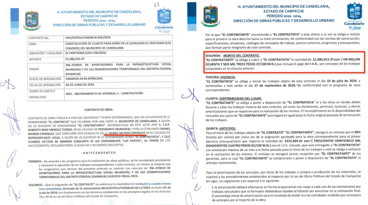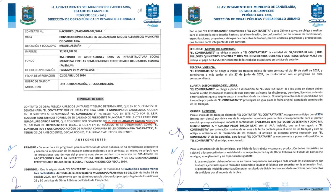 Otro es José Guadalupe García Nieto, que en los últimos meses de la administración ‘emecista’ de Candelaria, firmó tres contratos: HAC/DOPDU/FAISMUN-054/2024, firmado el 30 de julio de 2024 para la construcción de cuarto dormitorio en la localidad Candelaria, por un monto de $13,356,673.60 pesos; antes había firmado el HAC/DOPDU/FONDO PETROLERO-001/2024, el 29 de mayo, para bacheo de calles en la cabecera municipal, por $497,387.70 pesos; y el 24 de abril el HAC/DOPDU/FAISMUN-007/2024 para la construcción de calles en la localidad Miguel Alemán, por un $2,593,982.98 pesos; es decir, este proveedor se llevó más de $16.4 millones de pesos.
