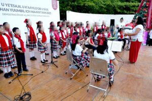El canto de niñas y niños en lengua materna se hizo presente en la explanada de la Secretaría de Educación del Gobierno del Estado de Yucatán (Segey), donde las y los estudiantes de los niveles Inicial, Preescolar y Primaria de Educación Indígena, así como del programa Ko’one’ex Kanik Maaya (Vamos a aprender maya), protagonizaron una emotiva demostración de villancicos en lengua maya, que llenó el recinto de orgullo, identidad y espíritu navideño.