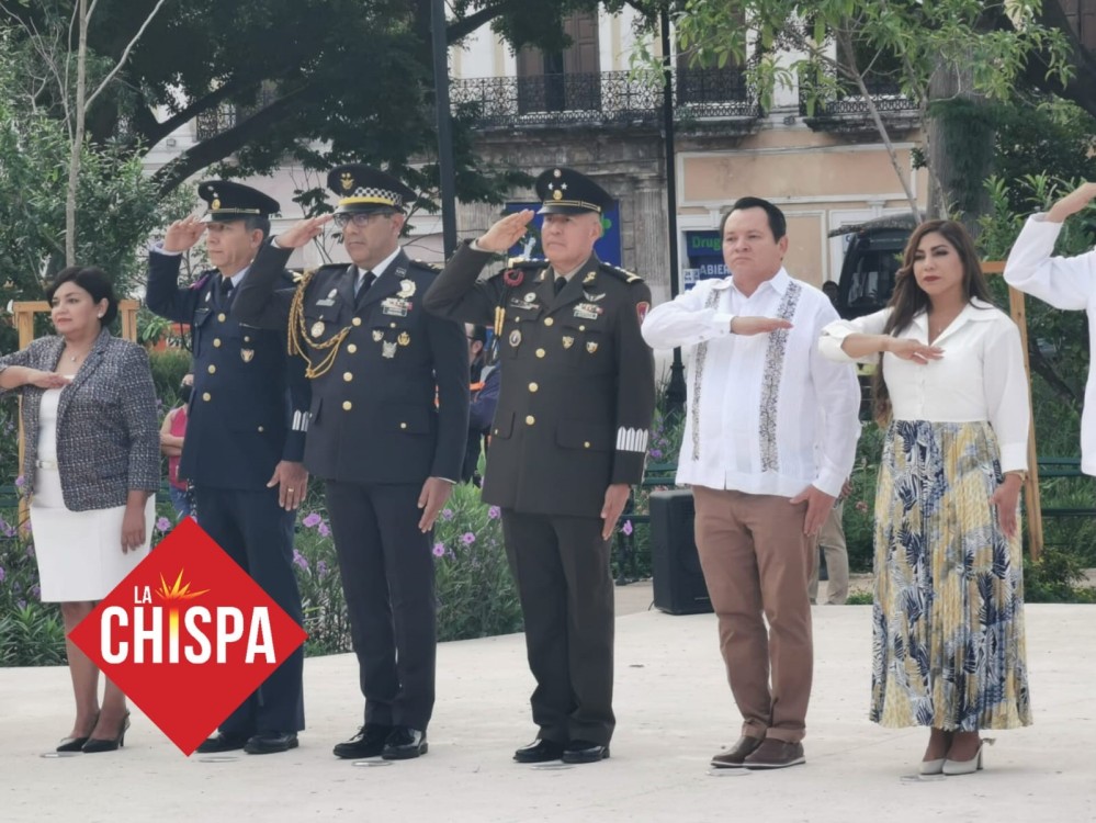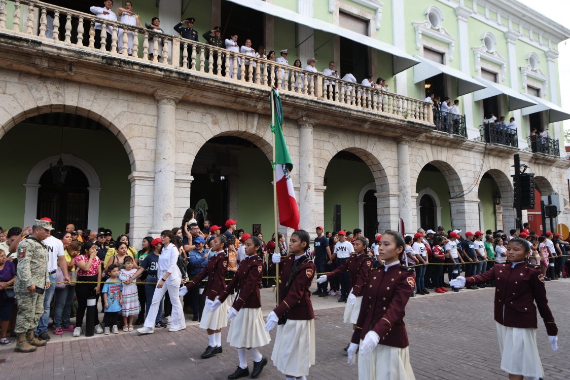 Antes del inicio del desfile, el gobernador encabezó la ceremonia de izamiento de la bandera en la Plaza Grande, acompañado por altos mandos militares y representantes de los poderes del estado, como la alcaldesa de Mérida, Cecilia Patrón Laviada.