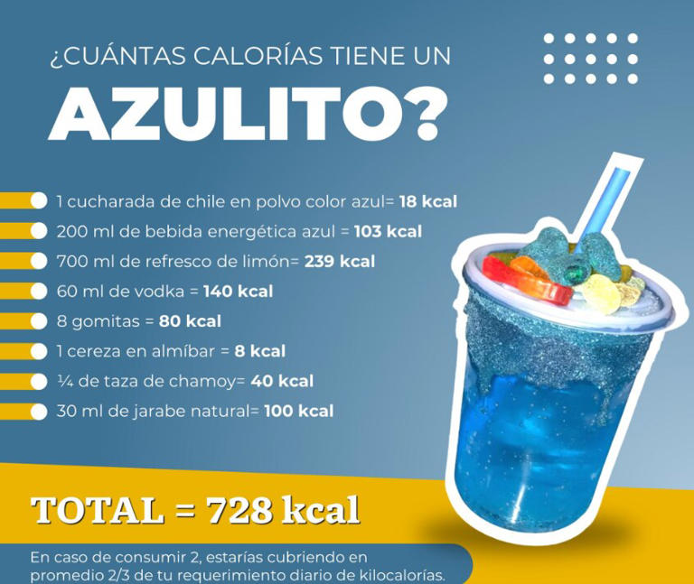 Sumado a lo ya mencionado, los “Azulitos” poseen un alto nivel de azúcar, lo cual puede favorecer a la obesidad o problemas con personas diabéticas. Un estudio demostró que cada vaso de “Azulito” tiene un total de 720 kcal en promedio, con tomar 2 ya cubriste 2/3 de las calorías que requieres en todo el día.