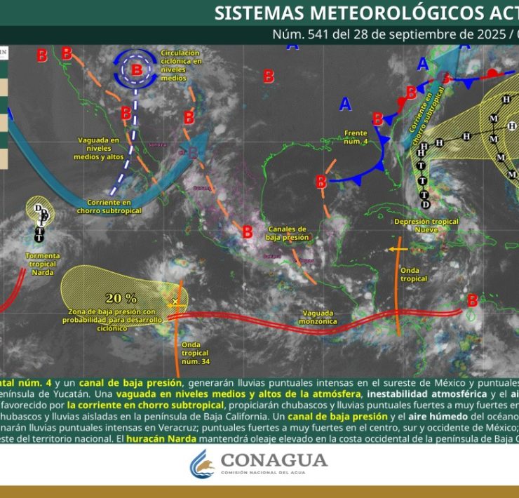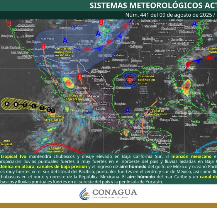 Este día, el monzón mexicano en interacción con inestabilidad atmosférica, ocasionará lluvias fuertes a muy fuertes en el noroeste del país, y lluvias con chubascos en Baja California Sur. Canales de baja presión sobre la Mesa del Norte, la Mesa Central y el occidente del territorio mexicano, en interacción con el ingreso de humedad del océano Pacífico y golfo de México, ocasionarán chubascos y lluvias fuertes a muy fuertes en el norte, centro y sur del territorio nacional; y con posible caída de granizo en el occidente de México. La onda tropical núm. 23, se desplazará al sur de la península de Yucatán, en interacción con una vaguada en altura que se desplazará sobre el sureste y el oriente mexicano, y con el ingreso de humedad del golfo de México, océano Pacífico y mar Caribe, ocasionarán lluvias fuertes a muy fuertes en las regiones mencionadas. La onda tropical núm. 22, se desplazará hacia el oeste dejando de afectar al país. Finalmente, continuará el ambiente caluroso a muy caluroso en zonas del norte de la República Mexicana, el litoral del Pacífico, el litoral del golfo de México y la península de Yucatán.