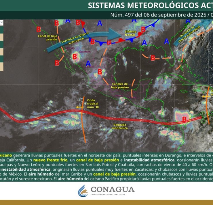 Mesa del Norte: Cielo medio nublado a nublado durante el día, con lluvias puntuales muy fuertes en Chihuahua y Durango, así como fuertes en Zacatecas, acompañadas con fuertes rachas de viento y posible caída de granizo; así mismo, podrían reducir la visibilidad en tramos carreteros, originar encharcamientos, deslaves e inundaciones, y el incremento en los niveles de ríos y arroyos. Chubascos en Coahuila, Nuevo León, San Luis Potosí y Aguascalientes. Todas las lluvias con descargas eléctricas. Por la mañana, ambiente templado a cálido en la región, y frío con temperaturas menores a 5 °C en sierras de Chihuahua y Durango. Durante la tarde ambiente cálido a caluroso en la región, y muy caluroso en el noreste de Chihuahua y este de Nuevo León. Viento del sureste de 20 a 30 km/h con rachas de 40 a 60 km/h en Chihuahua, Coahuila, Nuevo León, Tamaulipas, Durango, Zacatecas y San Luis Potosí, y de 10 a 25 km/h con rachas de 30 a 40 km/h en Aguascalientes.