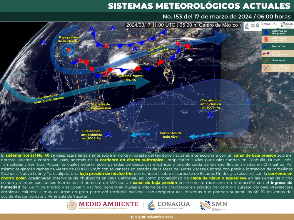 El Servicio Meterológico Nacional (SMN) prevé para este día, la masa de aire frío que impulsa al frente frío No. 40 será reforzada; dicho frente avanzará sobre el noreste y oriente del territorio nacional e interaccionará con un canal de baja presión sobre el sur del Golfo de México y el sureste mexicano, propiciando chubascos y lluvias fuertes a muy fuertes en dichas regiones, además de lluvias puntuales intensas en San Luis Potosí, Hidalgo, Puebla y Veracruz; dichas lluvias estarán acompañadas de descargas eléctricas y posible caída de granizo.