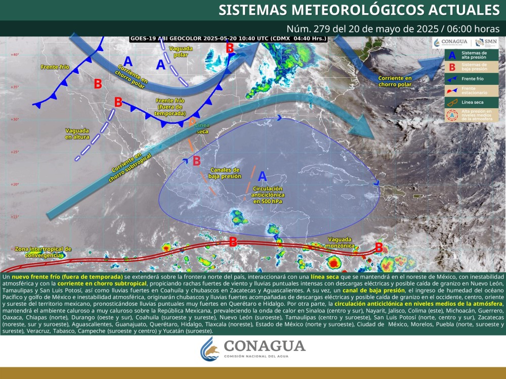 Persisten temperaturas extremas en amplias zonas del país Mientras tanto, el sistema anticiclónico en niveles medios de la atmósfera continúa intensificando la onda de calor, con temperaturas de hasta 45 °C en al menos 17 estados, entre ellos Sonora, Sinaloa, Guerrero, Oaxaca, Veracruz y Yucatán. El SMN recomienda evitar la exposición prolongada al sol, mantenerse hidratado y extremar cuidados con niños, adultos mayores y personas con enfermedades crónicas.