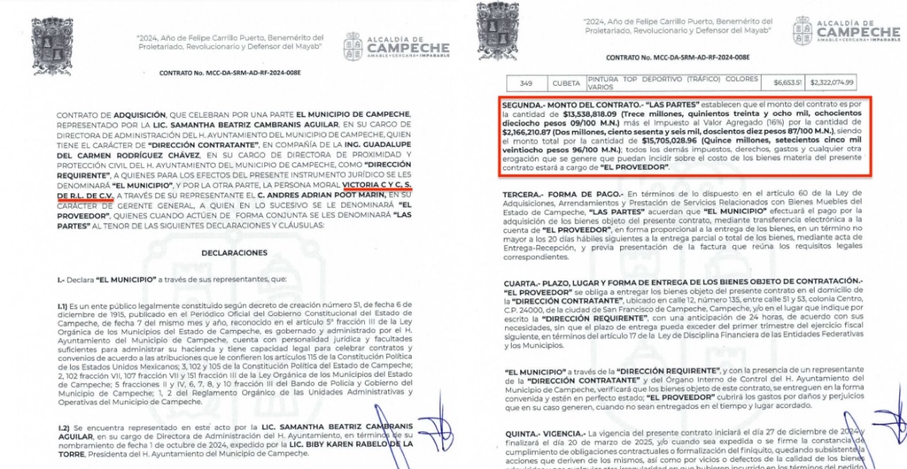 El 20 de diciembre, firmó el contrato MCC-DA-SRM-INV-2024-001 para adquisición de materiales para el mantenimiento de calles con trabajos de bacheo en el municipio de campeche por $3,005,072.8 pesos.