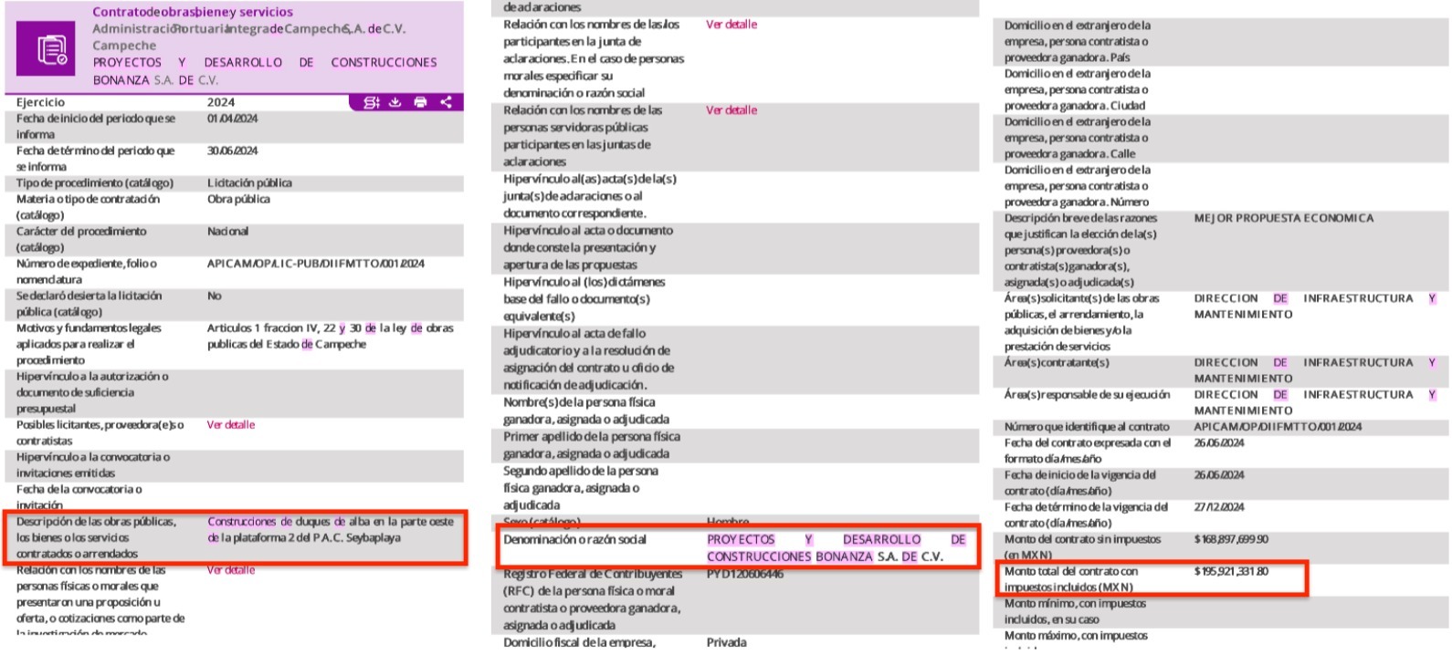 A la empresa Proyectos y Desarrollo de Construcciones BONANZA SA de CV se le entregó el pasado 20 de junio el contrato APICAM/OP/LIC-PUB/DIIFMTTO/001/2024 para las construcciones de duques de alba en la parte oeste de la plataforma 2 del Puerto de Altura y Cabotaje Seybaplaya por un monto de $195 millones 921 mil 331.80 pesos y que según las bases deben quedar listos en diciembre de este 2024.