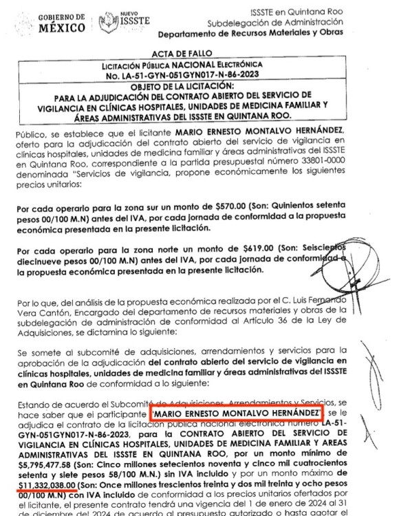 Los últimos días de 2023, el ISSSTE adjudicó a la persona física Mario Ernesto Montalvo Hernández los dos contratos. El primero de ellos fue a través de la licitación LA-51-GYN-051GYN017-N-85-2023 para los servicios de limpieza e higiene en clínicas hospitales, unidades de medicina familiar y áreas administrativas de la dependencia en Quintana Roo, por un monto máximo a ejercer de $15,145,175 pesos entre el 1 de enero y el 31 de diciembre de 2024.