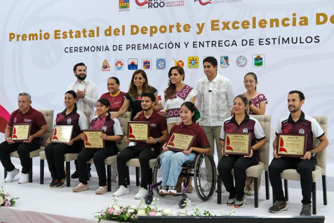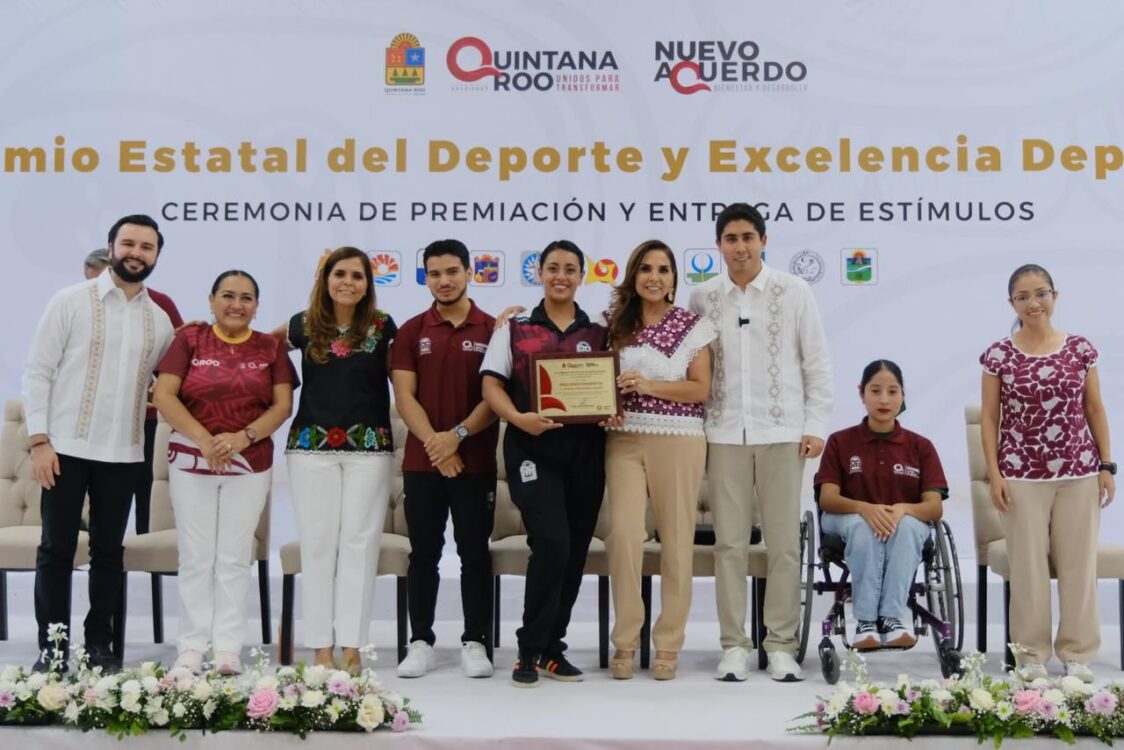 En el Centro Internacional de Negocios y Convenciones de Chetumal, Mara Lezama entregó reconocimientos a los ganadores del Premio Estatal del Deporte 2025: Andrés Dupont Cabrera, en la categoría de Deportista Convencional; Lya Daniela Sánchez Tadeo, Deportista Adaptado; Carlos Alberto Matos Zavala, entrenador de Levantamiento de Pesas; Yasmín Hernández Varela, entrenadora de Paradanza Deportiva; y la profesora Georgina Tatiana Roque Roque, Fomento Deportivo.