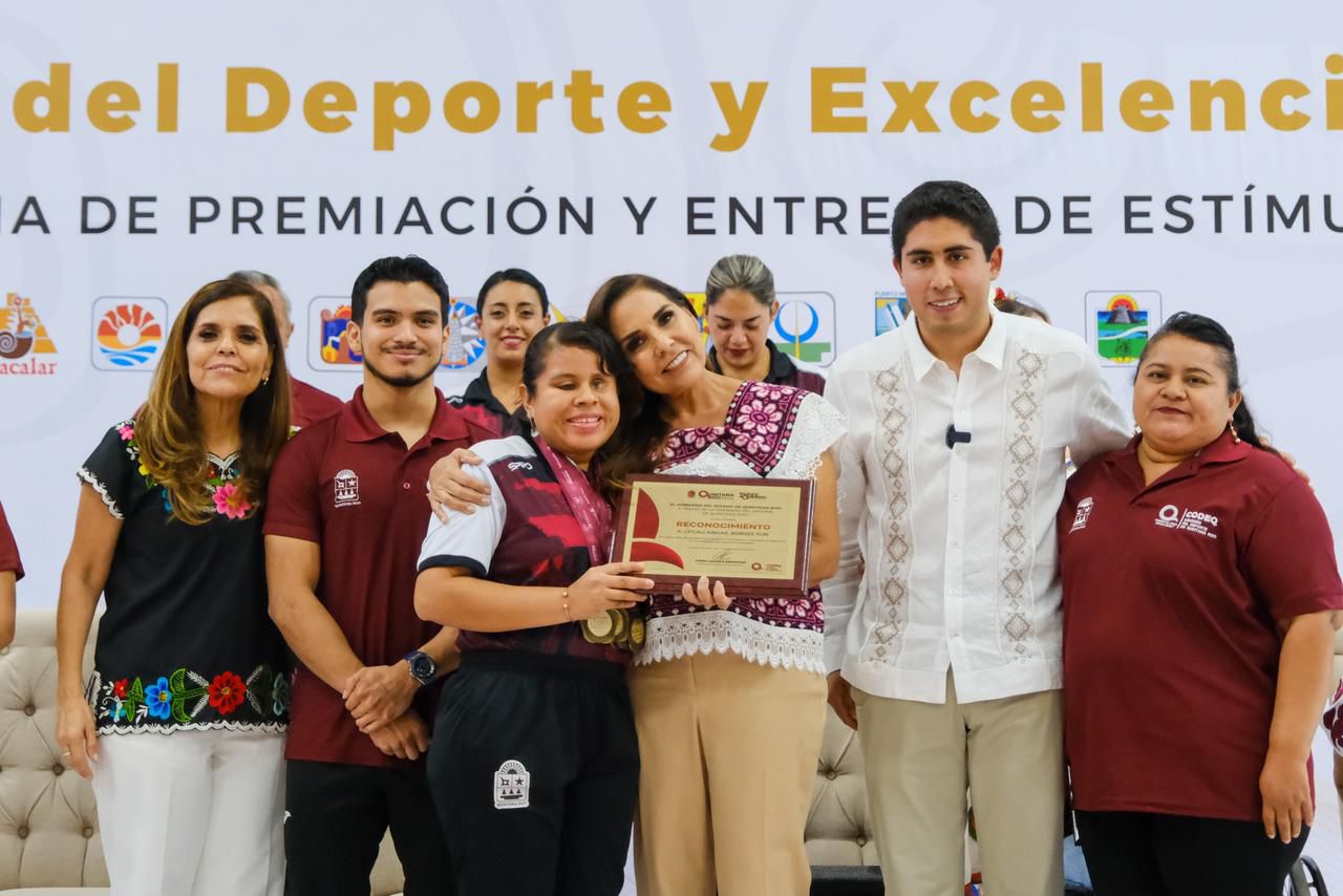 En el Centro Internacional de Negocios y Convenciones de Chetumal, Mara Lezama entregó reconocimientos a los ganadores del Premio Estatal del Deporte 2025: Andrés Dupont Cabrera, en la categoría de Deportista Convencional; Lya Daniela Sánchez Tadeo, Deportista Adaptado; Carlos Alberto Matos Zavala, entrenador de Levantamiento de Pesas; Yasmín Hernández Varela, entrenadora de Paradanza Deportiva; y la profesora Georgina Tatiana Roque Roque, Fomento Deportivo.