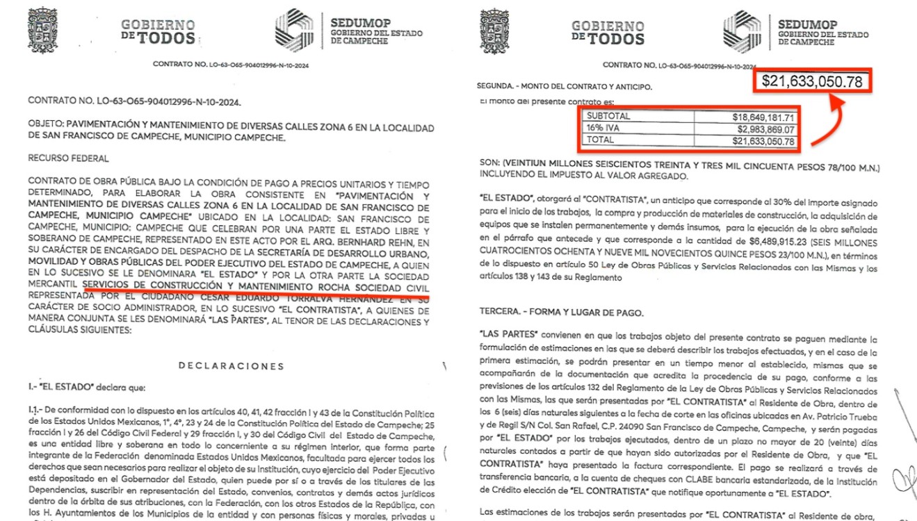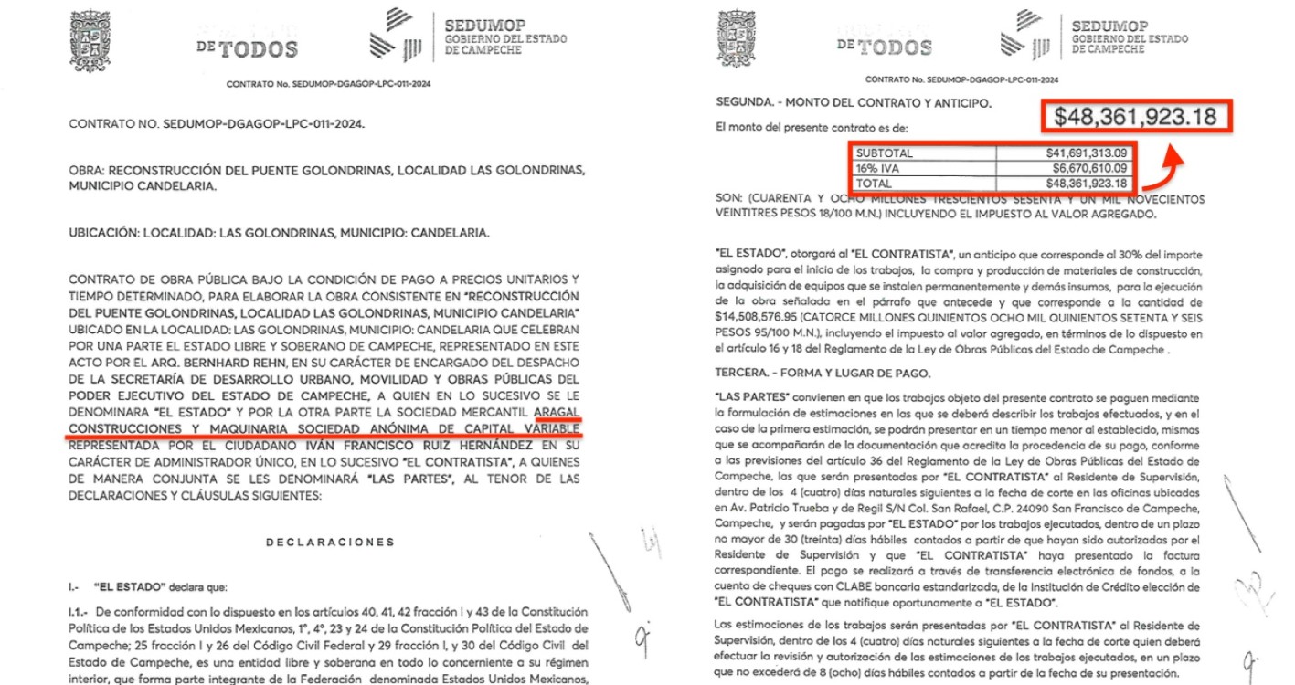 Esta empresa, tan solo en la Secretaría de Desarrollo Territorial, Urbano y Obras Públicas (SEDUMOP) tres contratos: SEDUMOP-DGAGOP-LPC-011-2024, para la reconstrucción del Puente Golondrinas, en el municipio de Candelaria, por $48,361,923.18 pesos; IO-63-O65-904012996-N-45-2023, para la pavimentación y mantenimiento de diversas calles de la localidad de Xbacab, Champotón, por $4,343,350.54 pesos; y LO-63-O65-904012996-N-36-2023, para mantenimiento del camino e.c. (Altunchén-Cayal) km 27+900 – Hool – Santa Cruz de Rovira, en Champotón, por $22,099,486.03 pesos.