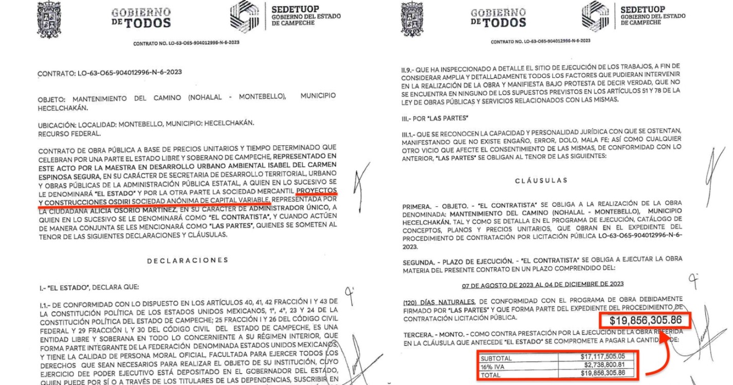 Otra es Proyectos y Construcciones OSDIRI SA de CV, también con domicilio fiscal en la ciudad de Oaxaca y que tiene como administrador único por Óscar Reyes Díaz, que obtuvo cuatro contratos en la SEDUMOP: LO-63-O65-904012996-N-2-2024, para la pavimentación y mantenimiento de diversas calles en la localidad de Champotón, por $19,857,019.39 pesos; LO-63-O65-904012996-N-6-2023, para el mantenimiento del camino (Nohalal-Montebello), en Hecelchakán, por $19,856,305.86 pesos; AO-904012996-E78-2022, para la reconstrucción de la carretera (Silvituc-Altamira de Zinaparo) km 12+000 – Chan Laguna, en Escárcega, por $4,328,629.02 pesos; y IO-904012996-E17-2022, para la reconstrucción del camino e.c. (Kikab- km 22+595) – Chilam Balam, en Champotón, por $7,869,405.99 pesos.