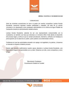 Este lunes, diversos medios de comunicación informaron sobre la detención en Campeche de Antonio Acosta Orlaineta, padre de la diputada local de Movimiento Ciudadano en Yucatán, Larissa Acosta Escalante.