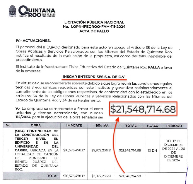 El segundo contrato fue adjudicado el pasado 13 de diciembre a través de la licitación LOPN-IFEQROO-FAM-111-2024, convocada por el Instituto de Infraestructura Educativa de Quintana Roo (IFEQROO) cuyo objeto era continuidad de la construcción del tercer nivel en Edificio E en la Universidad del Caribe, en Cancún.