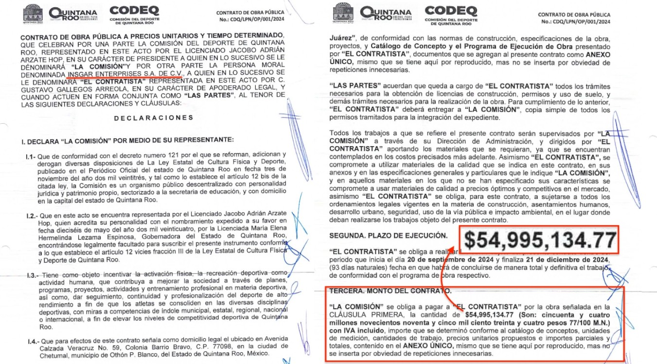 Al día siguiente, el 20 de septiembre, la empresa Insgar Enterprises, a través de su apoderado legal Gustavo Gallegos Arreola, firmó el contrato CDQ/LPN/OP/001/2024 por un monto de $54 millones 995 mil 134.77 pesos. Por parte de la CODEQ formalizaron el contrato Jacobo Adrián Arzate Hop, presidente de la Comisión del Deporte de Quintana Roo, así como los dos funcionarios que avalaron el fallo.