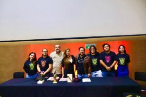 En mesa presídium: Karla Paola Medina, Directora y Productora del Festival Internacional de Cine de Mérida y Yucatán – FICMY Isaac basulto, Jefe de Producción de la Plataforma Short Film Race Rodolfo Hernández de Anda-Director de Máquina Producciones – Patrocinador del SFR