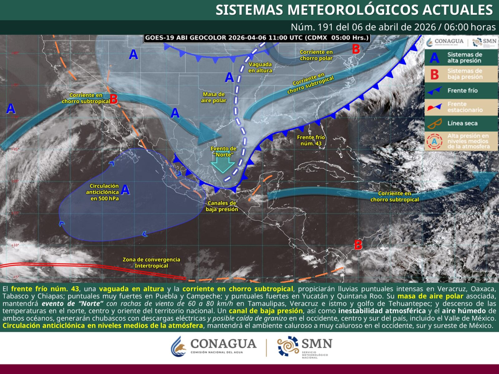 De acuerdo con el Servicio Meteorológico Nacional, este sistema frontal se extiende sobre el Golfo de México y, al combinarse con una vaguada en altura y la corriente en chorro subtropical, está generando lluvias de alta intensidad principalmente en el sureste del país.