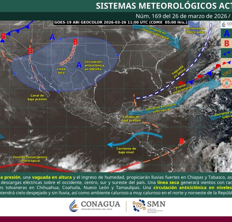La variabilidad meteorológica se atribuye al avance del frente frío 28, que se desplaza por el sureste y la Península de Yucatán.