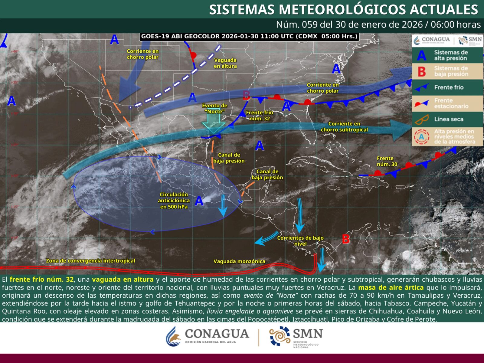 El Servicio Meteorológico Nacional mantiene vigilancia permanente sobre la evolución y desplazamiento del frente frío número 32, y exhorta a la población a mantenerse informada y atender las recomendaciones de Protección Civil, especialmente en zonas con riesgo por lluvias intensas, vientos fuertes, oleaje elevado y temperaturas extremas.