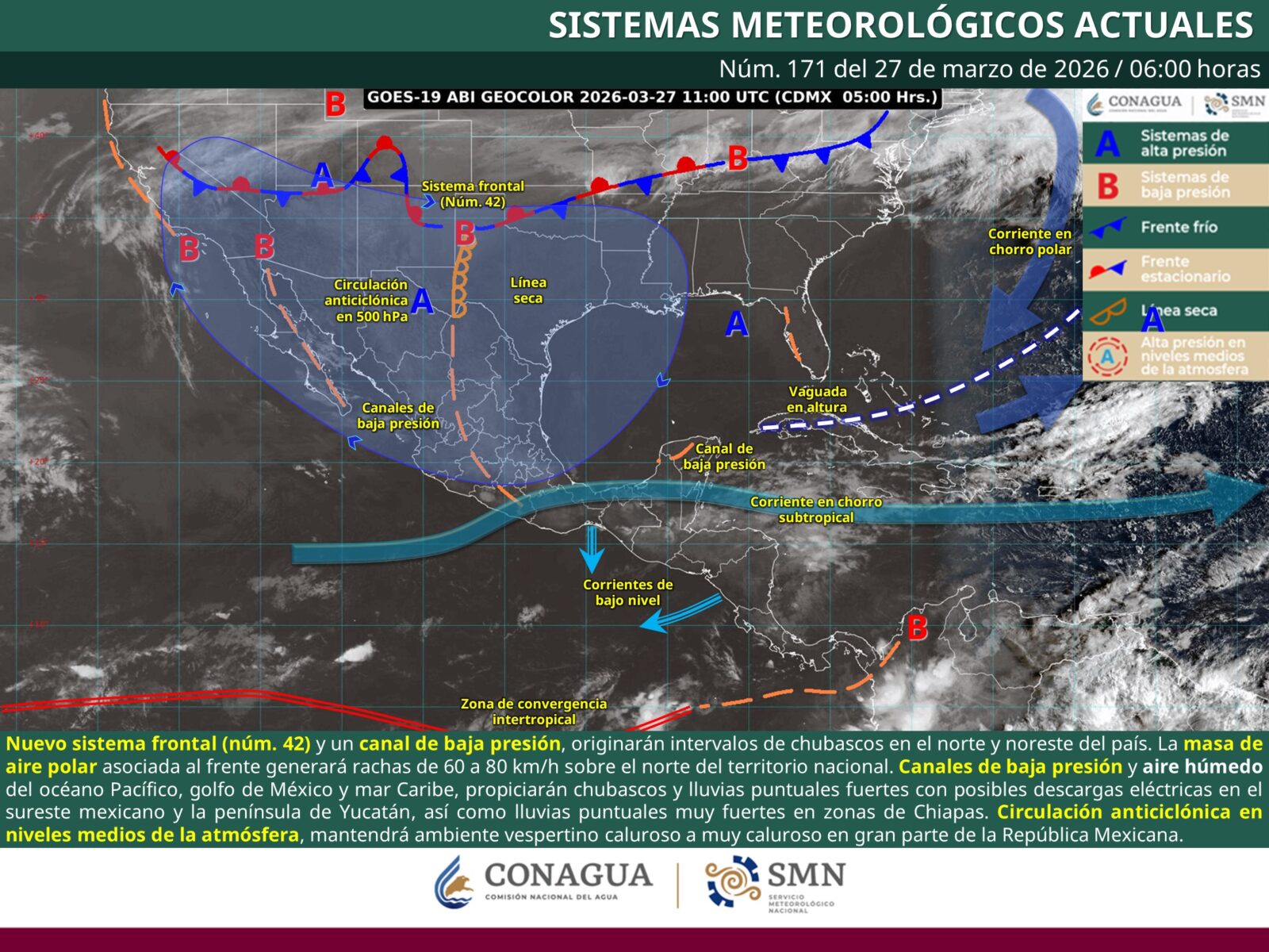 De acuerdo con el Servicio Meteorológico Nacional (SMN), el frente frío número 42 interactuará con un canal de baja presión sobre la Mesa del Norte, generando lluvias e intervalos de chubascos en entidades del norte y noreste del país, además de rachas de viento que podrían alcanzar entre 60 y 80 kilómetros por hora.