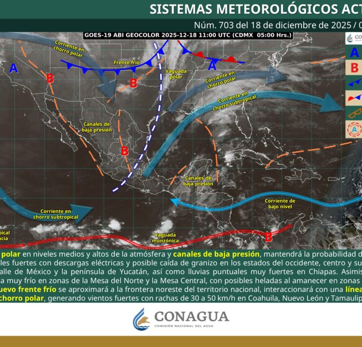 Además, la masa de aire ártico asociada al frente, originará evento de “Norte” con rachas de viento de 100 a 120 kilómetros por hora (km/h) en el Istmo de Tehuantepec, con oleaje de 4 a 6 metros (m) de altura en costas de Veracruz y el Golfo de Tehuantepec.