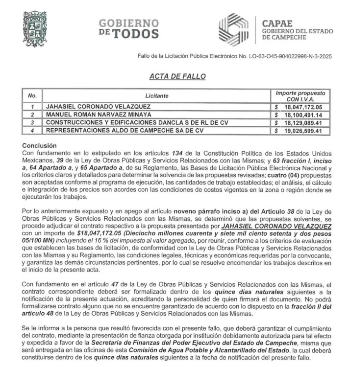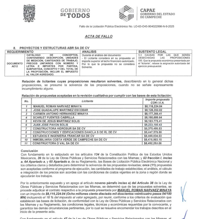 La persona física Manuel Román Narváez Minaya, que ha firmado tres contratos: Sistema de almacenamiento y distribución en la localidad de Alfredo V. Bonfil, en Campeche, por $8,116,224.04 pesos; sistema de almacenamiento (rehabilitación y construcción) en la localidad de Alfredo V. Bonfil, en Campeche, por $7,006,139.55 pesos; por último el mejoramiento del sistema de distribución de agua potable en las localidades Mangal, Tila y Ribera de la Corriente, de Palizada, 1ra etapa, por $5,468,887.12 pesos.