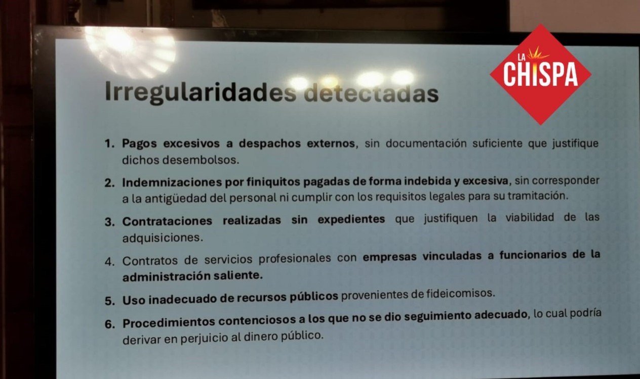 En su conferencia, Díaz Mena explicó que su administración encontró gastos sin etiquetar y un saldo de 11.3 millones de pesos en la cuenta de ingresos, mientras que los compromisos de pago pendientes sumaban 429.2 millones de pesos, por lo que existe un faltante inicial de 417 millones.
