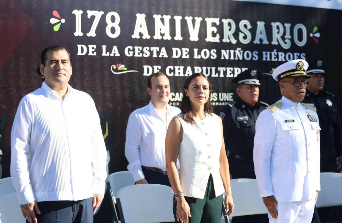 Cancún.- La Presidenta Municipal, Ana Paty Peralta y la Gobernadora, Mara Lezama, encabezaron la ceremonia conmemorativa por el 178 aniversario de la Gesta Heroica de los Niños Héroes, donde autoridades de los tres órdenes gobierno, fuerzas militares, instituciones educativas y ciudadanos rindieron homenaje a los cadetes que en 1847, defendieron con valentía la soberanía nacional frente al ejército estadounidense.