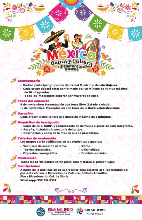 Isla Mujeres.- Con el objetivo de preservar las tradiciones, fortalecer la identidad nacional e impulsar el talento artístico local, el Gobierno de Isla Mujeres, encabezado por la Presidenta Municipal, Atenea Gómez Ricalde, abrió la convocatoria del concurso “México Danza y Cultura, 215° Aniversario de la Revolución”.