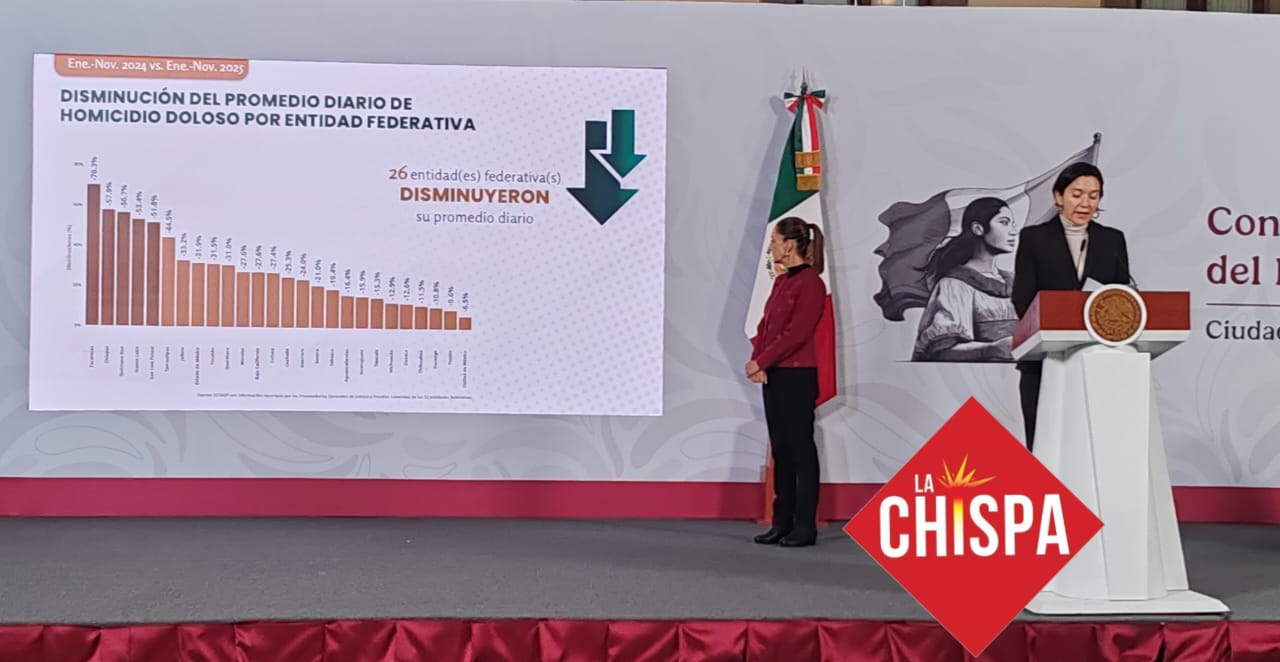 Durante “Las mañaneras del pueblo”, Sheinbaum subrayó que entre septiembre de 2024 y noviembre de 2025 el promedio diario de homicidios dolosos cayó 37 por ciento, al pasar de 86.9 víctimas a 54.7, lo que equivale a 32 homicidios menos cada día. Con ello, noviembre de 2025 se posiciona como el mes con menor incidencia desde 2015.