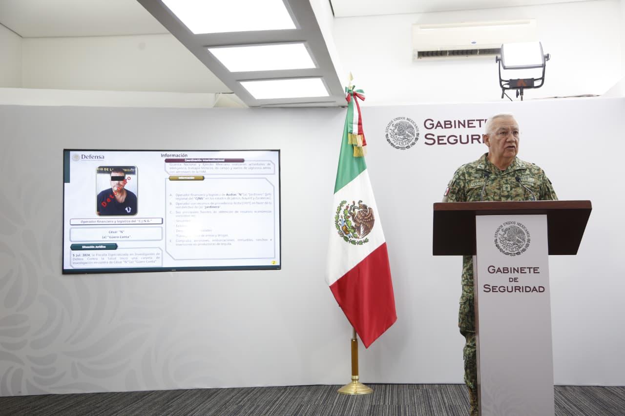 El secretario de la Defensa Nacional, Ricardo Trevilla Trejo, explicó que este individuo coordinaba esquemas de lavado de dinero y administración de recursos ilícitos, los cuales eran utilizados para adquirir armamento, aeronaves, propiedades y sostener la operación criminal.