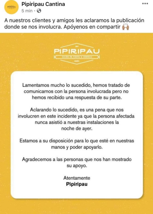 Pipiripau Cantina emitió un comunicado en donde se deslindó de la versión del muchacho quien asegura fue al bar y ahí fue presuntamente drogado. Fuente: Eco Yuc.