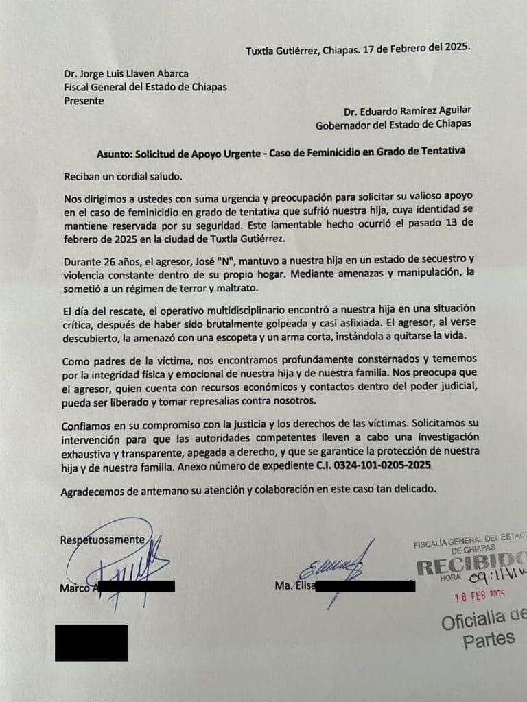 “El día del rescate, el operativo multidisciplinario encontró a nuestra hija en una situación crítica, después de haber sido brutalmente golpeada y casi asfixiada. El agresor, al verse descubierto, la amenazó con una escopeta y un arma corta, instándola a quitarse la vida“, detallaron los padres en una carta dirigida a la Fiscalía.