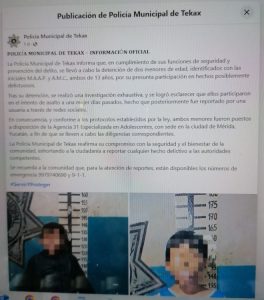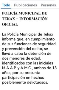 La Policía Municipal de Tekax informó que, en cumplimiento de sus funciones de seguridad y prevención del delito, se llevó a cabo la detención de dos menores de edad, identificados con las iniciales M.A.A.P. y A.M.C., ambos de 13 años, por su presunta participación en hechos posiblemente delictuosos.
