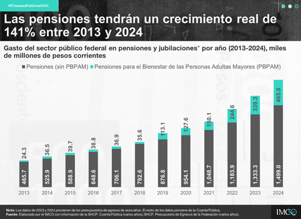 Solo en 2024 se asignaron en el Presupuesto de Egresos de la Federación (PEF) un total de 1.96 billones de pesos para el pago de pensiones, de los cuales 1.50 billones de pesos corresponden a pensiones contributivas y 465.0 mmdp al PBPAM. Este monto, que equivale a una quinta parte (21.7%) del gasto neto total aprobado o 5.7% del PIB estimado para ese ejercicio fiscal, es 141.2% mayor en términos reales al observado en 2013 (490.0 mmdp).
