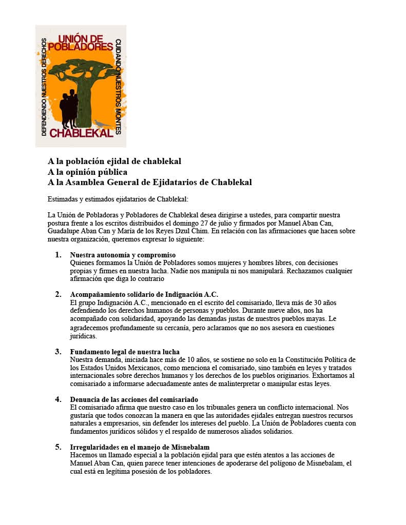 Han advertido que la lucha de la comunidad maya va resistir hasta que les hagan justicia y no los despojen de sus tierras. La Unión de Pobladores y Pobladoras de Chablekal ha denunciado la deforestación ilegal del monte de Misnébalam y la venta de tierras a empresas inmobiliarias.