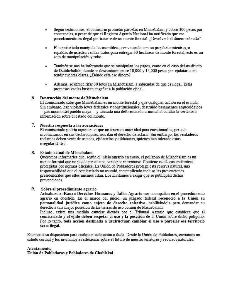 Cabe destacar que las denuncias y Acusaciones por La Unión de Pobladores y Pobladoras de Chablekal exhiben que el comisariado ejidal ha vendido 390 hectáreas de tierras de uso común a Carlos Abraham Mafud y Mauricio Montalvo Vales por 6,540,000 pesos.