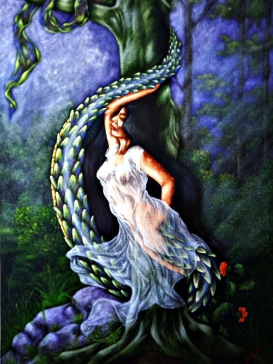 Por su parte, el artista Hipólito Uicab García participó con su pieza “Metamorfosis”, un acrílico sobre tela que representa al personaje en el momento de cambiar su forma de serpiente en esa mítica y hermosa mujer tomando como resguardo el árbol de la ceiba, esperando a quien se atreva a pasar por sus dominios, el fondo es un tono grisáceo que da a entender que se acerca ya la noche.