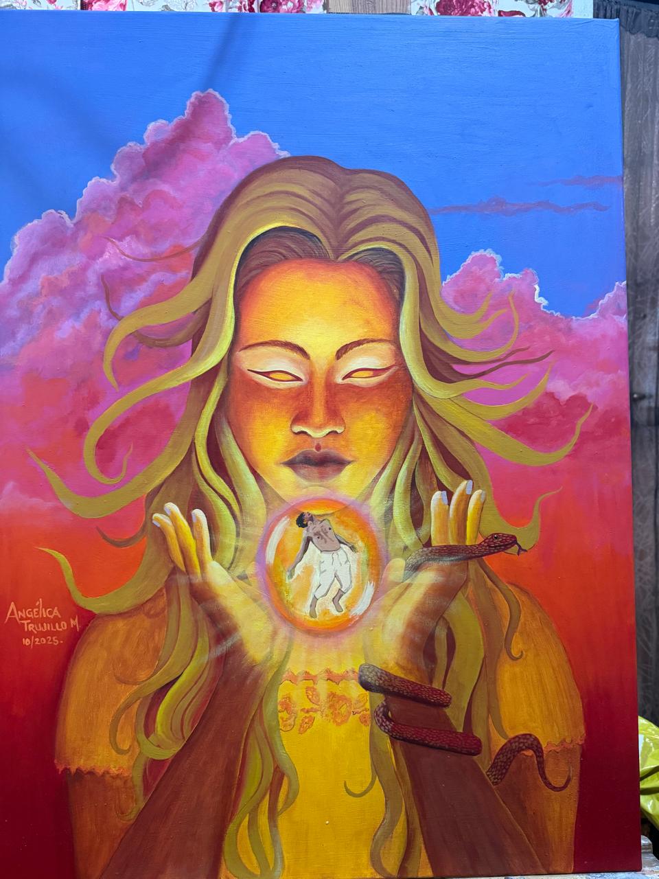 Con dos impresionantes piezas sin título: una en carbón sobre papel Fabriano y otras en acrílico sobre lienzo, la pintora Angélica Trujillo muestra una nueva manera de interpretar a la Xtabay a través del surrealismo místico.