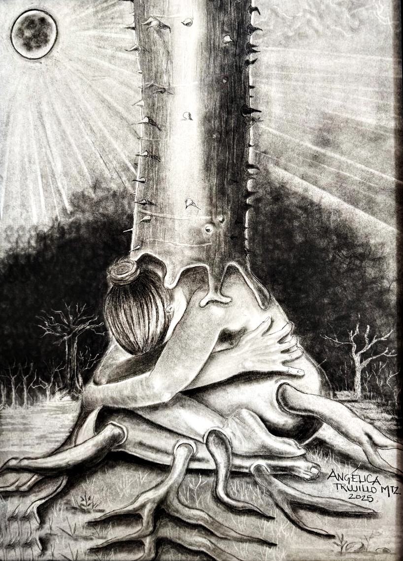 Con dos impresionantes piezas sin título: una en carbón sobre papel Fabriano y otras en acrílico sobre lienzo, la pintora Angélica Trujillo muestra una nueva manera de interpretar a la Xtabay a través del surrealismo místico.