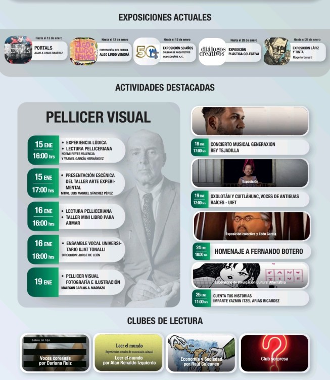 Para el jueves 16, en esta misma sede, a las 16:00 horas, se programó Lectura pelliceriana y el taller Mini libro para armar; a las 18:00 horas, el Ensamble vocal universitario UJAT Tonalli, bajo la dirección de Jorge de León; el sábado 18, a las 5 de la tarde, el concierto musical “Generaxion Rey Tejadilla”; el domingo 19, a las 12:00 horas, la exposición “Oxolotán y Cuitláhuac, Voces antiguas raíces”, por la Universidad Intercultural del Estado de Tabasco (UIET).