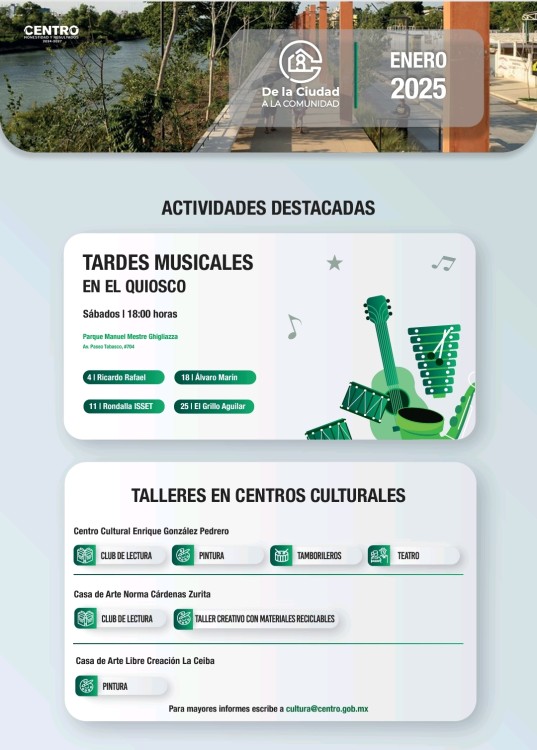 La programación completa de la agenda cultural para enero de 2025 puede ser consultada en la dirección web: https://www.villahermosa.gob.mx