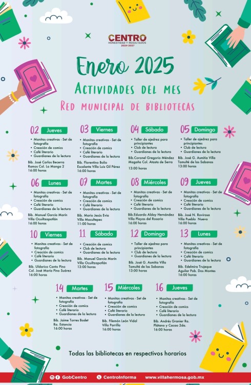 En forma permanente, las actividades del mes de enero en la Red de bibliotecas de Centro, en sus respectivos horarios, abarca el set de fotografías “Manitas creativas”, creación de comics, café literario, guardianes de la lectura, taller de ajedrez para principiantes y el taller de manualidades para bibliotecarios “Los amigos y la lectura”. Como actividades continuas: círculos de lectura, hora del cuento, asesoría en tareas y la hora de la investigación, así como del cuento.