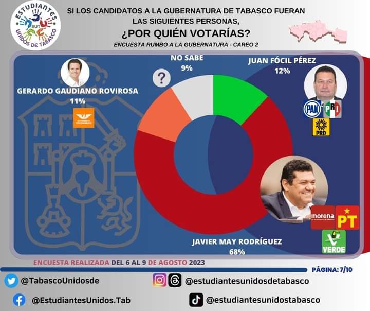 En la nominación de Morena y sus aliados PT-Verde, Javier May Rodríguez tiene un contundente 35% en las preferencias. Le sigue la alcaldesa de Centro, Yolanda Osuna Huerta con un 10%; seguida por César Raúl Ojeda Zubieta con un 9%.