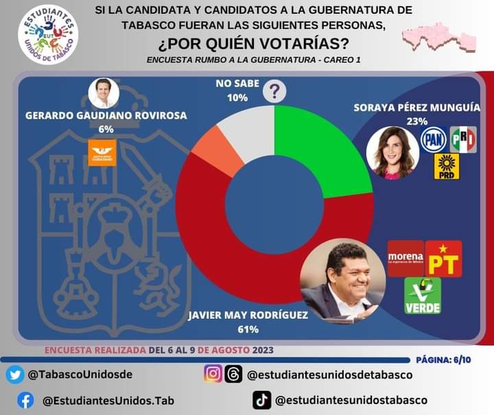 La medición busca conocer los mejor evaluados por coalición. En el caso de la alianza PRD-PRI-PAN, la diputada local Soraya Pérez Munguía es la mejor posicionada con un 27% sobre Juan Manuel Fócil Pérez y Gerardo Gaudiano Rovirosa, quienes tienen un 15% cada uno.