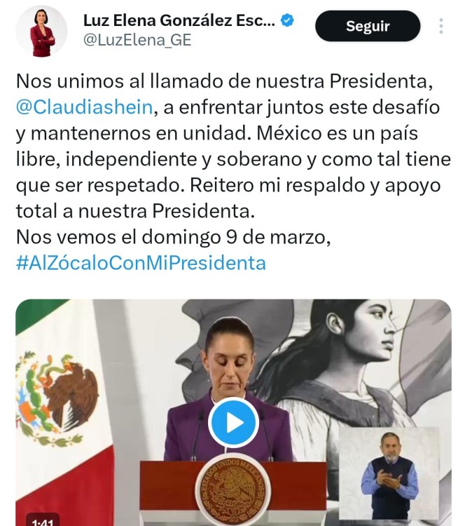 “Nos unimos al llamado de nuestra Presidenta Claudia Sheinbaum a enfrentar juntos este desafío y mantenernos en unidad. México es un país libre, independiente y soberano y como tal tiene que ser respetado. Reitero mi respaldo y apoyo total a nuestra Presidenta”, se lee en las redes sociales de la funcionaria.