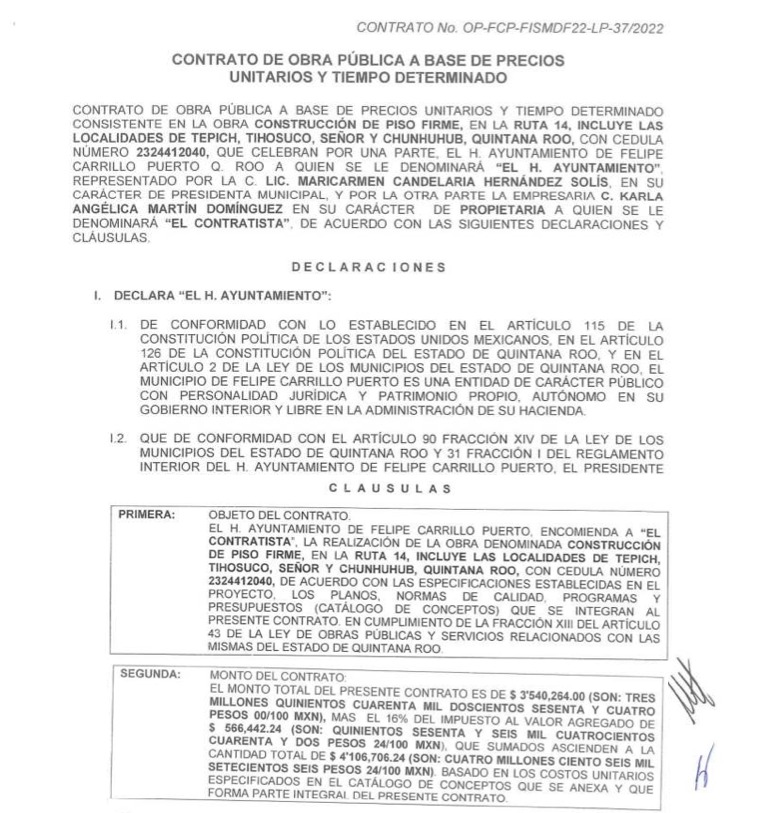 El más reciente contrato otorgado a Karla Angélica Martín Domínguez se firmó apenas el 4 de agosto de 2023 y es el número OP-FCP-FAISMUN23-LP-22/2023 para la realización de la obra denominada construcción de techo firme de vigueta y bovedilla en la Ruta 2, que incluye las localidades de Dzoyola, Nuevo Israel, Nueva Loria y Emiliano Zapata por la suma de 7 millones 250 mil 779.62 pesos.